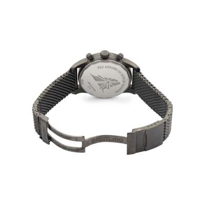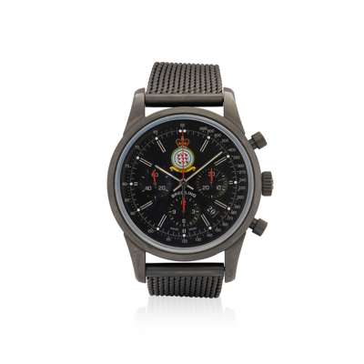 Self-winding mechanical movement black dial with applied steel baton indexes, outer luminous dots, central Royal Air Force Acrobatic Team ‘Red Arrows’ logo with Latin motto, ECLAT, black subsidiary dials with red hands for 30 minute & 12 hour chronograph registers, running seconds, date aperture between 4 & 5, PVD stainless steel circular case with steel screw-down reverse featuring Red Arrows 50 Display Seasons motif and edition number 2/15, on fitted PVD stainless steel fine-link Breitling bracelet with folding, locking, clasp. Case, dial and movement signed.