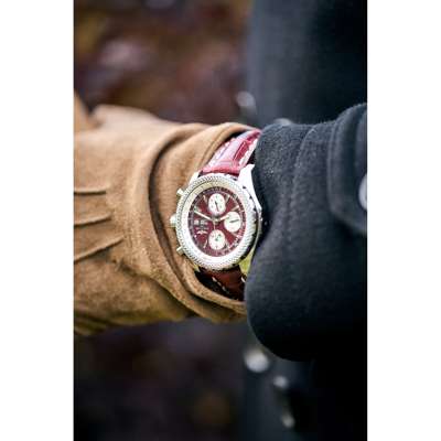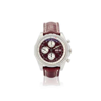 Cal.13B, self-winding movement, burgundy coloured dial with applied steel indexes, outer luminous blocks, silvered subsidiary dials for 30 minute & 12 hour chronograph registers, running seconds, calibrated revolving rehault, apertures for day and date, steel luminous hands, substantial stainless steel case with screw-down dedicated reverse, angled shoulders, on Breitling burgundy crocodile strap with steel Breitling pin buckle. Case, dial and movement signed.