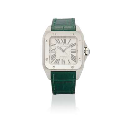 Cal.049 self-winding movement, silvered dial with Roman numerals, inner minute track, black luminous hands, centre seconds, large stainless steel case with numbered reverse and 1904-2004 dedicated, secured by screws, cabochon set crown, polished square bezel secured by screws, on fitted matt green Cartier alligator strap with stainless steel Cartier double folding locking buckle. Case, dial and movement signed.