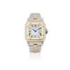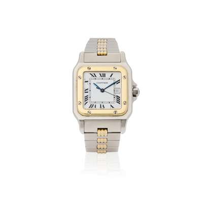 Self-winding movement, white dial with black Roman numerals, secret signature within VII, inner square minute track, date aperture, blued steel hands, centre seconds, stainless steel case with square gold bezel secured by screws, cabochon set crown, on fitted stainless steel and gold Cartier bracelet with folding clasp. Case, dial and movement signed.