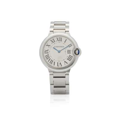 Quartz movement, silvered dial with black Roman numerals, inner minute track, blued steel hands, stainless steel circular case with reverse secured by screws, enclosed cabochon set crown, on fitted stainless steel Cartier bracelet with concealed double folding clasp. case, dial and movement signed.