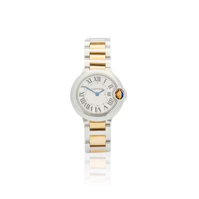 Quartz movement, silvered dial with black Roman numerals, inner minute track, blued steel hands, stainless steel circular case with reverse secured by screws, enclosed cabochon set crown, on fitted stainless steel and three gold links to each side Cartier bracelet with concealed double folding clasp. Case, dial and movement signed.