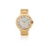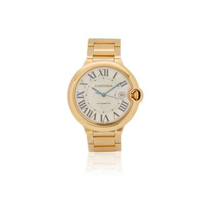 Self-winding 21 jewel movement, two-tone silvered dial with central sunburst design, outer Roman numerals, inner minute track, date aperture, blued steel sword hands, centre seconds, 18k yellow gold circular case with numbered reverse secured by gold screws, enclosed cabochon set crown, on fitted 18k yellow gold Cartier bracelet with concealed double folding, locking, clasp. Case, dial and movement signed.