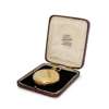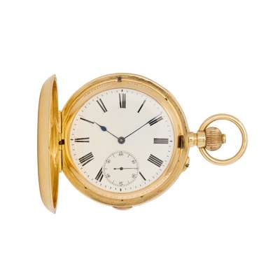 Swiss nickel finished keyless wind two-train movement jewelled with screwed chatons to the centre, lever escapement, overcoil hairspring, striking with three hammers, white enamel dial with black Roman numerals, subsidiary seconds, blued steel leaf hands, bezel with strike/silent lever signed to the lower Arthur Jack & Co, Cheltenham, substantial 18k gold hunting case with monogrammed reverse (PCS) and engraved plumed crest to the cover with slogan ‘HOC AGE’ (THIS AGE), repeat activation button to the band, case numbered, bezel signed.