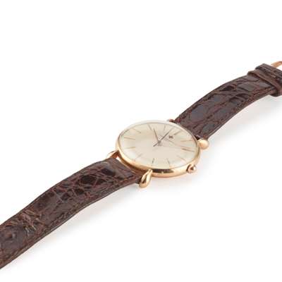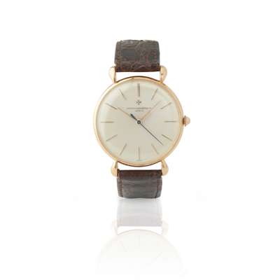 Cal.V454, hand-wound, 17 jewel movement adjusted to temperatures with shock protection and micro-adjustment, silvered dial with applied pink gold baton markers, baton hands, blued steel centre seconds, 18k pink gold circular case with prominent tear-drop lugs, on dark brown crocodile strap with 18k pink gold Vacheron Constantin buckle. Case, dial and movement signed.