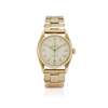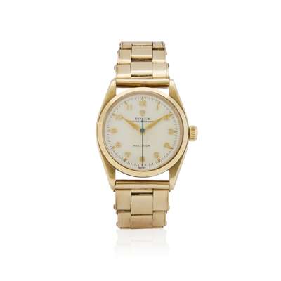 Hand-wound 17 jewel movement (No.N45774), white dial with applied gilt numerals, outer luminescent dots, luminescent index hands, blued centre seconds, 9k gold Oyster case with screw-down reverse stamped with reference, 235086 and Glasgow 9k import mark for 1956 to the inner, screw-down Oyster crown, polished bezel, upper case stamped .375 between the lugs, on 9k gold Rolex riveted expanding link bracelet with folding clasp stamped Rolex Made In England, WAB and CY & Co with Birmingham 9k hallmark for 1958. Case, dial and movement signed.