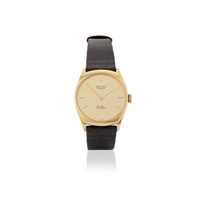 Cal.1601 hand-wound movement, champagne dial with applied gold faceted baton indexes, gold baton hands, 18k gold tonneau shape case, Rolex winding crown, possibly original Rolex crocodile strap, 18k gold Rolex buckle. Case, dial and movement signed.