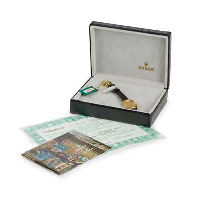 Accompanied by a black Rolex presentation case within Rolex Cellini branded card outer with sticker 4129.8 to the side, black Rolex wallet, Cellini booklet, punch numbered Rolex UK guarantee dated 9th August 1997.