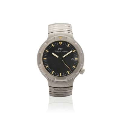 Cal.37521 self-winding 21 jewel movement adjusted to five positions, matt black dial with outer tritium hour markers, white minute track, white tritium baton hands, red highlighted centre seconds, date aperture, circular titanium case with screw-down reverse numbered to the outer edge and inner, unidirectional rotating bezel with 60 minute triangle, on integrated IWC titanium bracelet with locking clasp. Case, dial and movement signed.