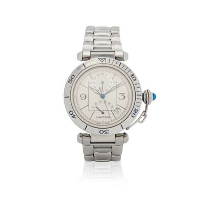 Cal.480 self-winding 30 jewel movement, silvered ‘sunburst’ sectored dial with 3, 9 numerals, luminous quarter dots, upper independently set 24hr subsidiary dial with central grided globe, lower fan-form 50 hour power reserve, date aperture, luminous leaf hands, centre seconds, stainless steel circular case with numbered glazed reverse secured by screws, cabochon set screw-down crown guard with securing chain, flat band with inset 24hr adjuster, unidirectional rotating bezel calibrated to 60 minutes, on fitted stainless steel Cartier bracelet with concealed double-folding clasp. Case, dial and movement signed.