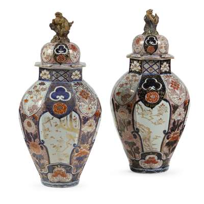 江戶 伊萬里燒花鳥紋六方帶蓋大瓶(一對)
