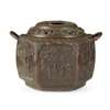 each panel decorated with figures engaging in scholarly activities, pieced cover, the base cast with Xuande mark, bronze