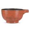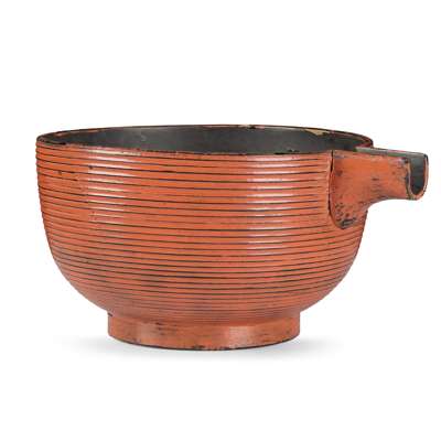 the one-spouted sake bowl with grooved exterior, interior and base covered in black lacquer, exterior with red