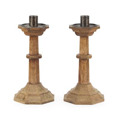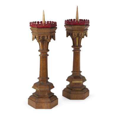 oak, with gilt highlighting and with painted red metal trays, 56.5cm and 57.5cm high (22 ¼in and 22 ⅓in high); together with a further PAIR OF CANDLESTICKS, oak and steel, each 30cm high (11 ¾in high) (4)