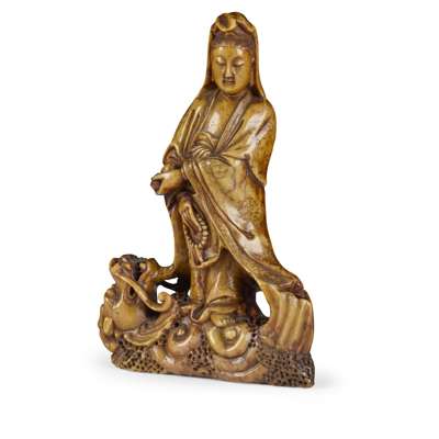 carved with Avalokiteshvara standing on the belly of a dragon-fish on waves, left hand crossed to the right side holding a double-gourd, right hand holding a rosary, robe incised with cloud details, soapstone