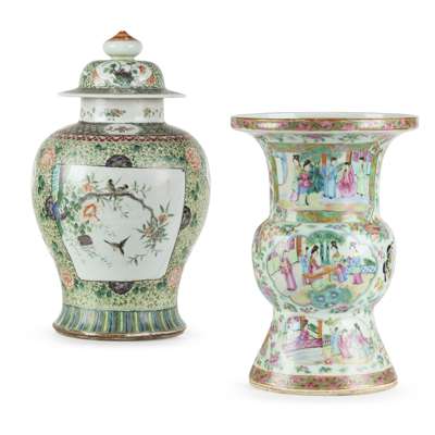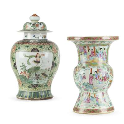 comprising: a Canton famille rose gu vase and a famille verte baluster vase with cover, painted and glazed porcelain (2)
