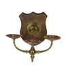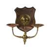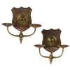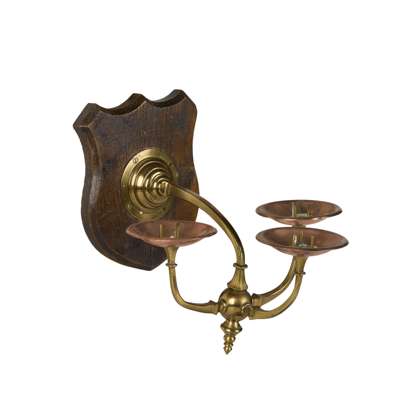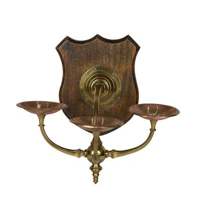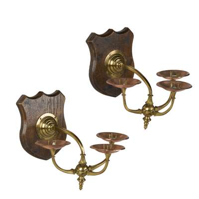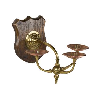 each with stamped manufacturer's mark, copper and brass on oak wall mounts (2)