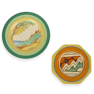 ‘Sunrise’ printed FANTASQUE BY CLARICE CLIFF HAND PAINTED WILKINSON LTD ENGLAND, ‘Secrets’ BIZARRE BY CLARICE CLIFF HAND PAINTED NEWPORT POTTERY ENGLAND, painted and glazed earthenware (2)