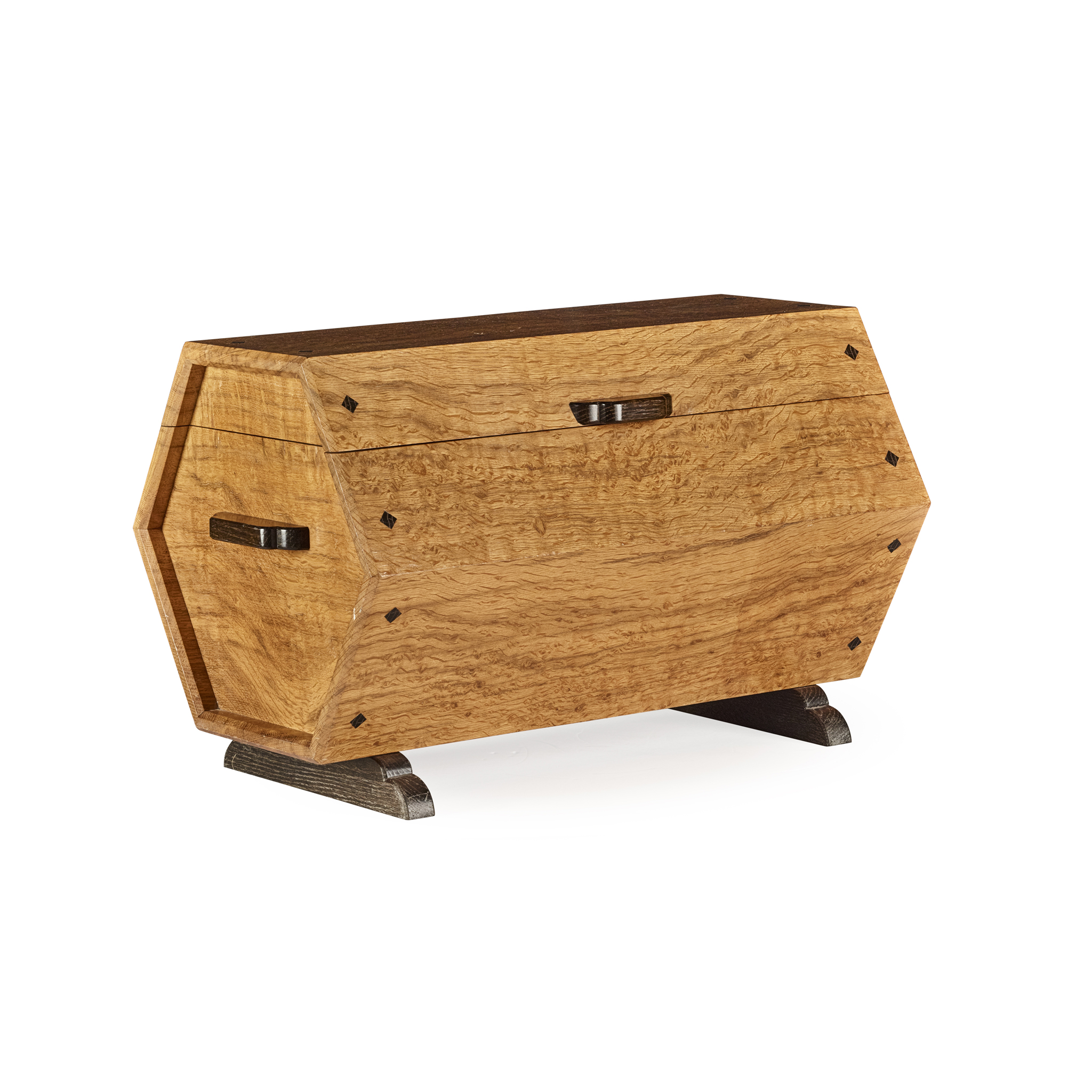 walnut and bog oak, with bog oak and boxwood inlay, the hinged lid opening to reveal a fitted interior with lift out tray