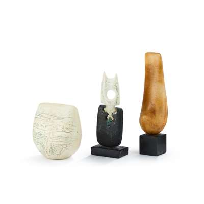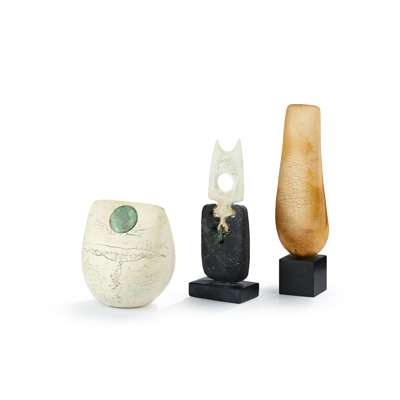 signed, raku, 13cm high, 12cm wide (5 1/8in high, 4 ¾in wide); together with PETER HAYES, TWO TOTEM FORMS, the larger example signed and dated 93 on the base, each raku on slate bases, the larger example 26cm high (10 ¼in high) and the smaller example 10.5cm high (8 1/8in high) (3)