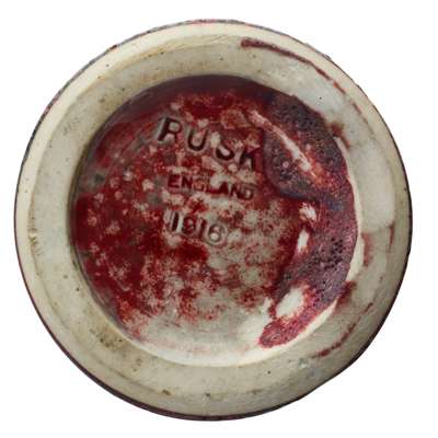 impressed RUKSIN ENGLAND 1916, ox-blood and lavender glaze, stoneware