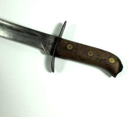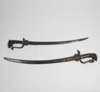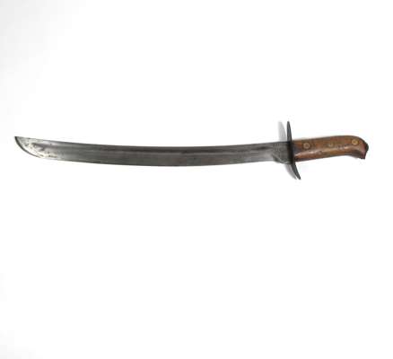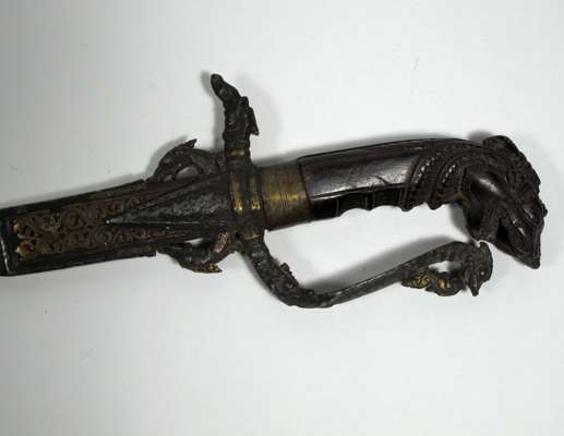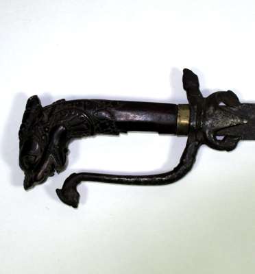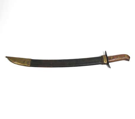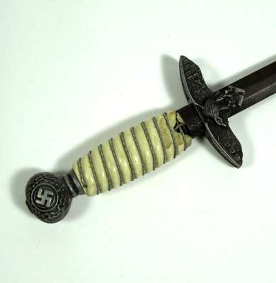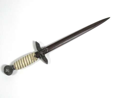 with animal decorated hilts, the carved wood hilts with grotesque beast pommels, the forward guard carved with a similar grotesque animal, the forward quillion similarly decorated with single edged curved blades, 27in. (68cm) and 23in. (58cm) long; a German World War II?Luftwaffe dagger, decorated with swastikas and eagles, 15in. (38cm); a German pioneer short sword, with brass bound scabbard, wooden slab grip fitted with three rivets, slightly curved single edged blade in its original brass mounted leather scabbard the, ricasso struck HEMBRUG,