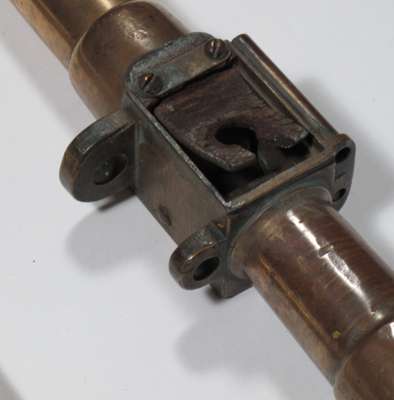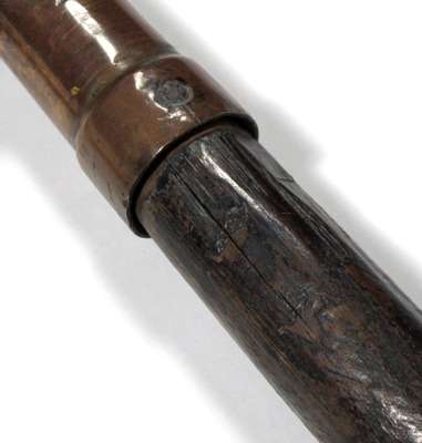 with two bolts and shortened wooden haft, the lock mostly missing, round brass barrel with spare bolt, the bolts with leather padding around the base to form a gas seal (2)