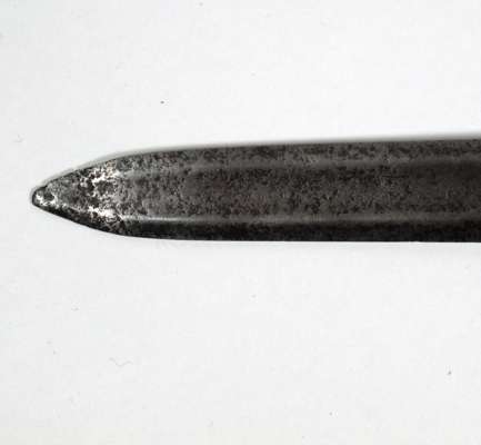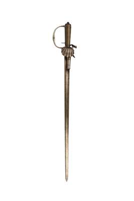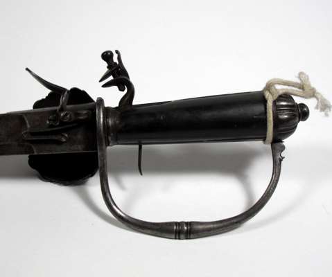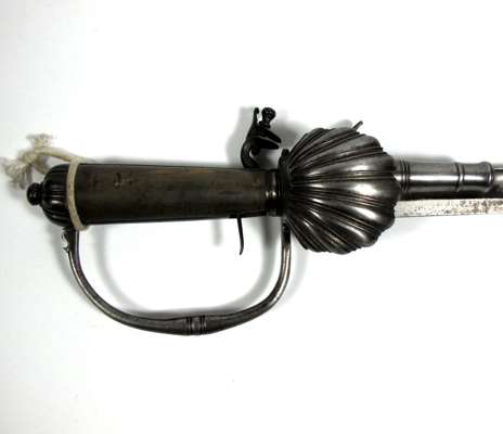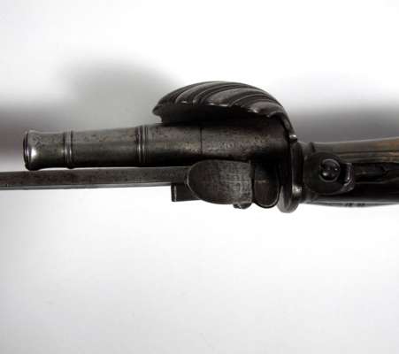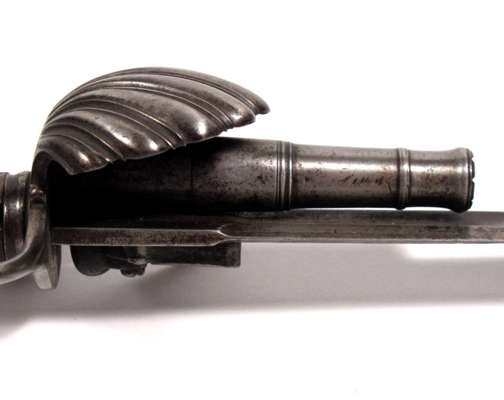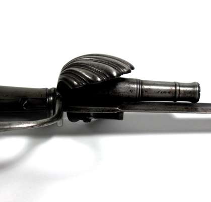 with boxlock action concealed in the centre of the slab sided horn grips, the pan and frizzen to the left of the blade with the four stage cannon barrel with flared muzzle to the right, and partly concealed by the well-formed scallop shell guard, turned knuckle guard and gadrooned, bun shaped pommel, single edge blade with central fuller