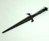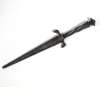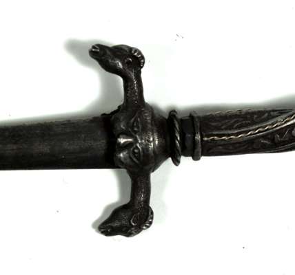 with spiral silver inlaid grip and sheep’s head quillions with facemasks, in original scabbard similarly decorated, with plain double edged blade