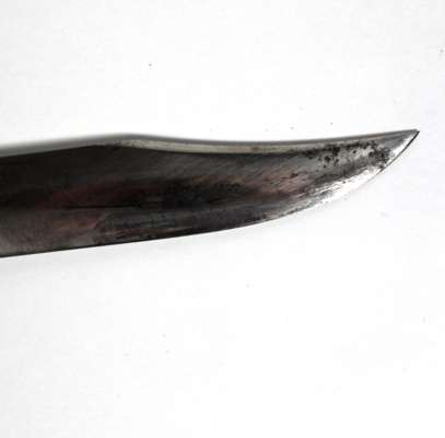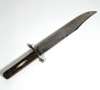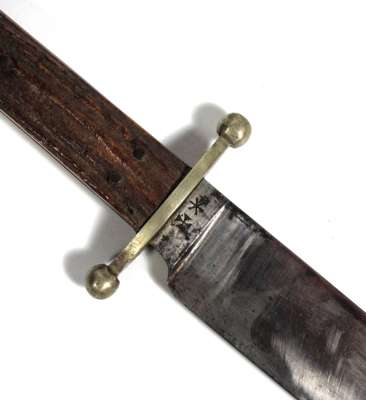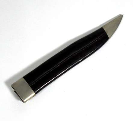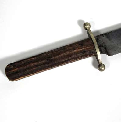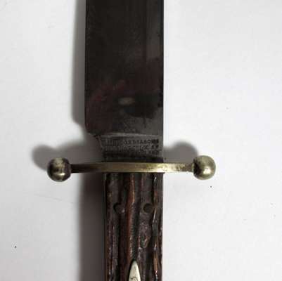 staghorn grip with blank white metal escutcheon of elongated shape, clipped single edged blade with curved tip, white metal, one side of the blade engraved with a star and a Maltese cross; the other engraved J Rodgers and Sons No 6 Norfolk Street, Sheffield England, in original white metal mounted scabbard