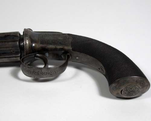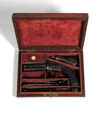 the action engraved “Horsley York” on one side and “Improved Revolving Pistol” on the other, the barrels retain much of the original case hardened colour, the finely chequered walnut butt with blank silver escutcheon set within a lozenge, the hemispherical butt with inset trap for spare lead balls with engraved cover, in original mahogany case with flush fitting inset brass carrying handle in the lid, lined with original faded maroon velvet fitted with accessories, a copper powder flask, a combined bullet mould and ramrod numbered 92, a fine small ebony handled turnscrew, an ebony handled ramrod/cleaning rod and a tin of Ely pistol caps
