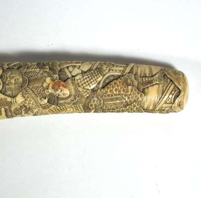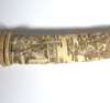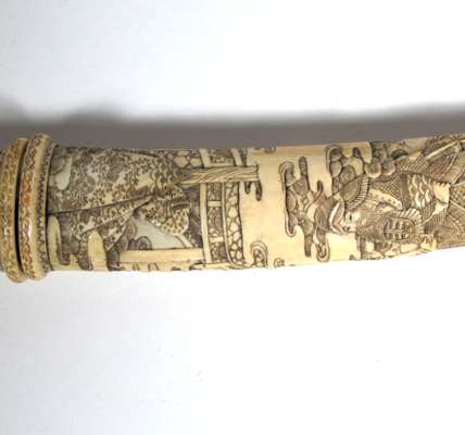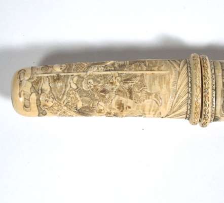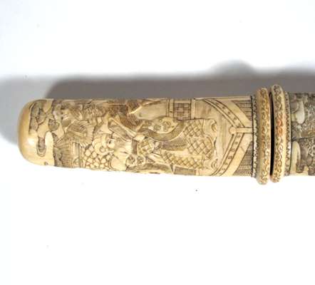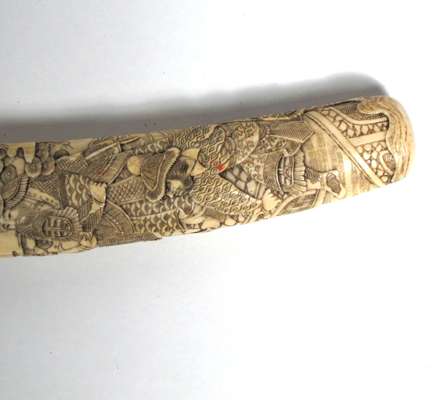 with polished single edge watered blade, the ivory hilt and scabbard carved entirely with oriental scenes