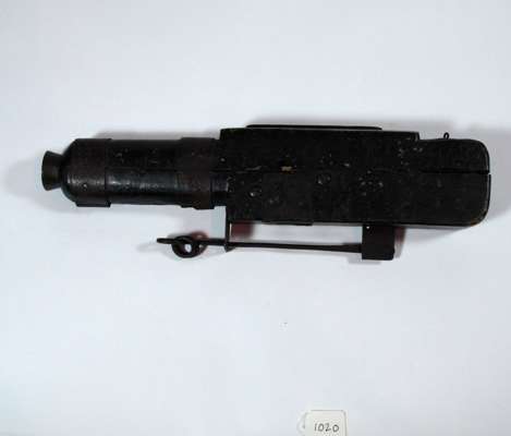 the lock inset into a stained wood stock, the short flared barrel clamped by the stock and bound with an iron band, a metal bar running from the trigger attaches to a tripwire, remains of an old paper label