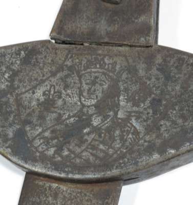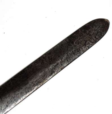 the metal grip of two joined sections riveted together shaped with broad fan shaped flare at the pommel and quillion terminals (with overall hammered surface) with plain blunt double edge blade