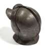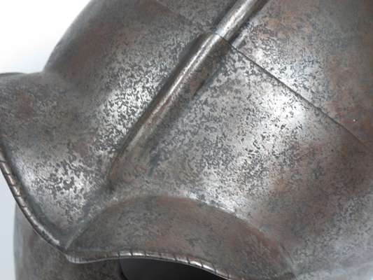 with skull in two pieces seamed and riveted at each end, with double visor, the top section with hooded eye brows with rope moulding, low roped comb with hook and eye latch, no lining