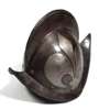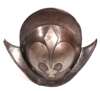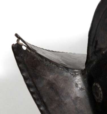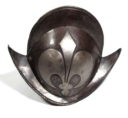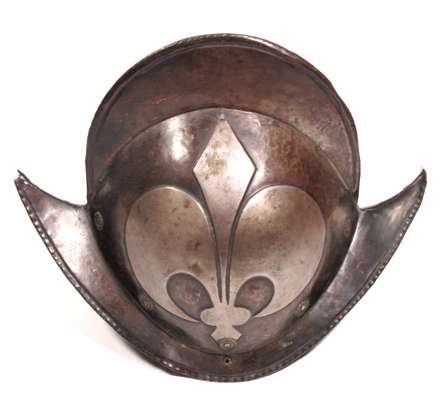 formed of two piece skull, with hemispherical crown rising to high comb, integral brim turned down slightly at the sides, decorated with large fleur-de-lys either side, projecting to points at front and rear eight decorated copper rivet heads, five one side, three the other side