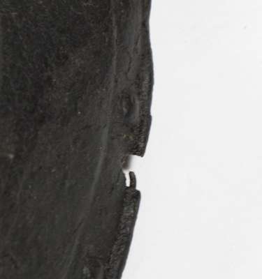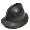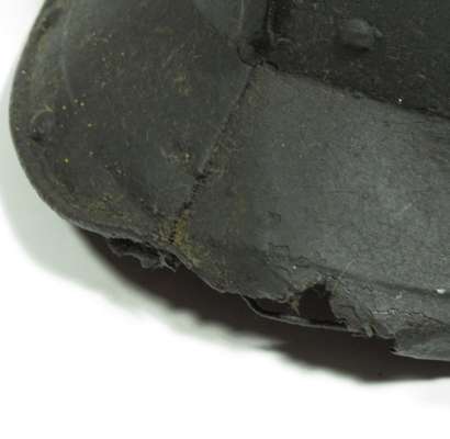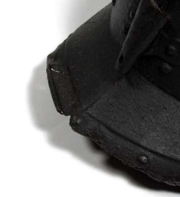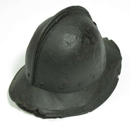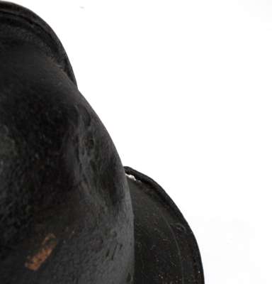 the skull made in two sections with low raised comb moulded, the down turned rim (damaged at front and rear) with twelve raised rivets on the skull and thirteen on the rim for the missing liner, the ear defences missing, with rear plume holder