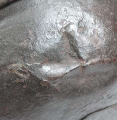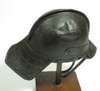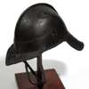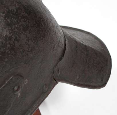 the skull in two pieces with low moulded turned comb, the visor with three bars (twisted) with fixed shallow pointed lobstertail simulating three lames, missing its liner with an old inventory number 114, on a modern stand