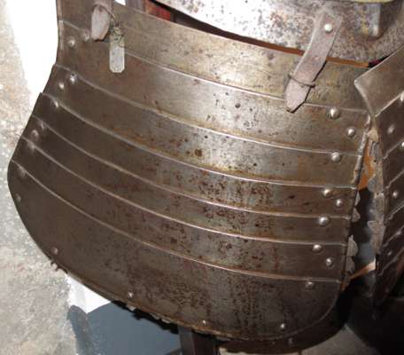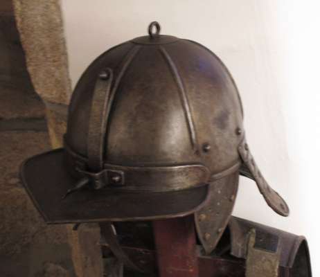 helmet of one piece hemispherical skull, embossed with roped ribs and with top ring, pointed fixed fall pierced for a movable nasal bar secured by a wing-headed screw, bluntly pointed neck guard and four upward lapping lames, triangular pierced ear pieces, domed steel lining rivets and turned borders, bullet proof breast plate showing the mark of a musket ball, tassets of seven lames are associated and etched with foliate decoration