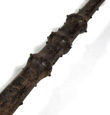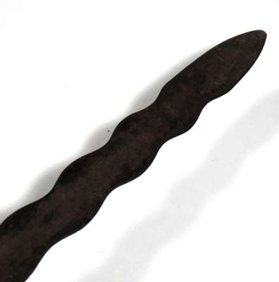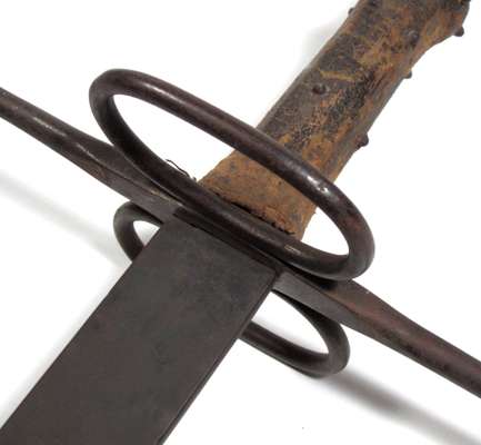 with wavy blade, the grip divided into four sections with three central knops covered in faded material and studded with dome headed nails, the ball pommel with a screw head, the cross guard with two loops and large quillions with double edge wavy blade