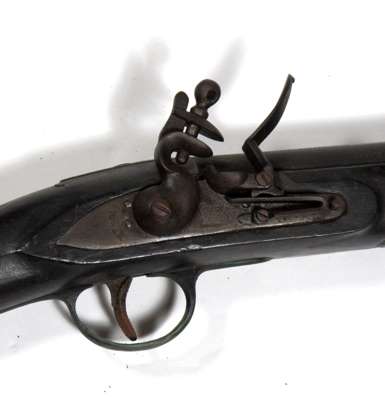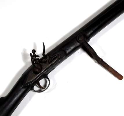 with brass butt, the lock signed TOWER and with a tower crown, full walnut stock, rounded barrel with flared muzzle, square ended butt with brass butt plate, central iron swivel bolted through the stock at the balance