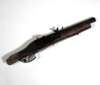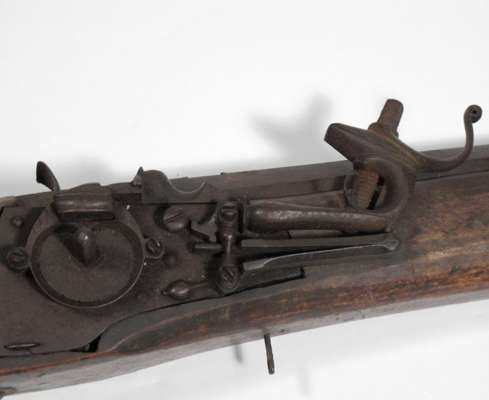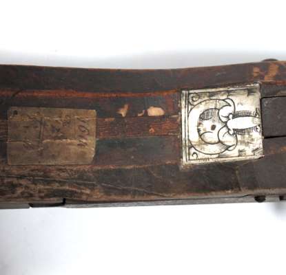 engraved square inlaid bone plaque on top of the stock, very old paper label dated 1614, the crude stock (split along the inside) with old tin plate trigger guard, small inlaid plaque at the base of the barrel tang engraved with the face of a bull with a ring in its nose, octagonal barrel