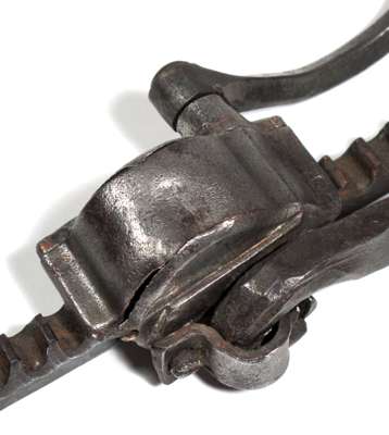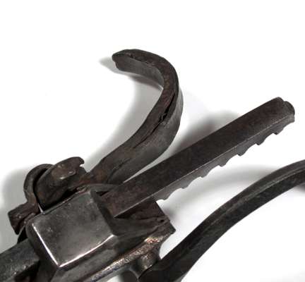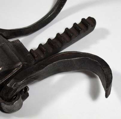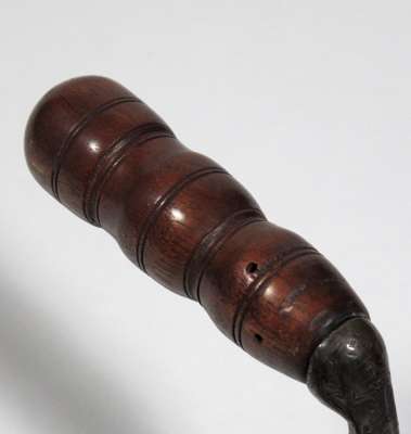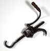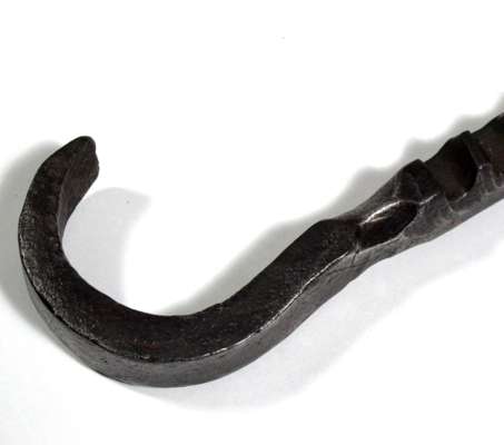 plain box single hook on ratchet, large single hook below ratchet box, cranking handle with replacement turned wooden grip