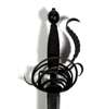 the guard with square section raised ring guards down turned arms of the hilt, flattened hook quillion with large leaf shaped forward guard, the wooden grip tightly bound with a double twist of copper wire with a large ball pommel, the long flat double edged blade with four crude fullers at the ricasso