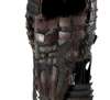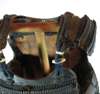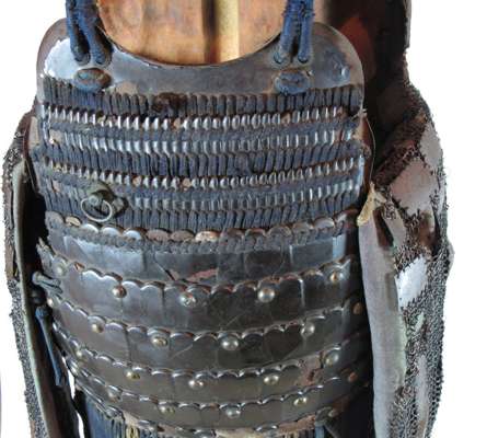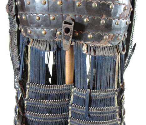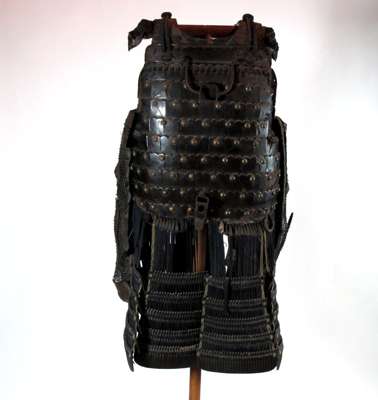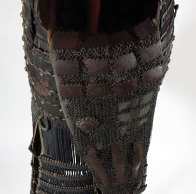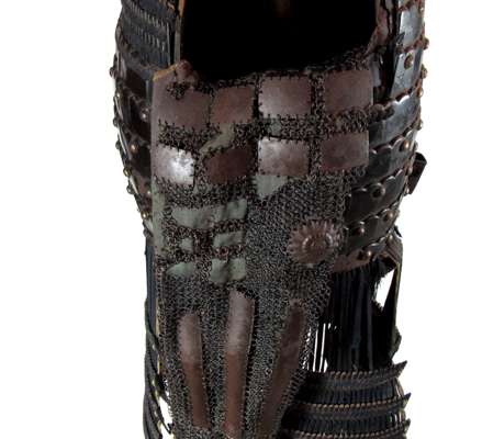 comprising a breast plate constructed of interlocking plates surmounted by a section of vertical rods with cords attaching the back plate with vambrace and tassets of black cord, the two arm sections covered with fine mail patinated iron strips and plates terminating in fingerless gauntlets decorated with flower heads, the back plate with iron bracket and with original leather lining, on a modern wood stand