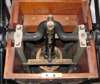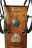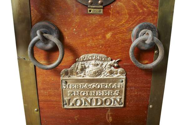 with cast brass makers label “Siebe & Gorman Engineers London” with two large iron six spoke wheels and with turned ebony winding handles, the hardwood case with pressure gauge inserted on to the front signed Siebe Gorman, the bottom door with a brass flap embossed AIR with four iron lifting rings