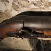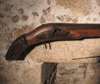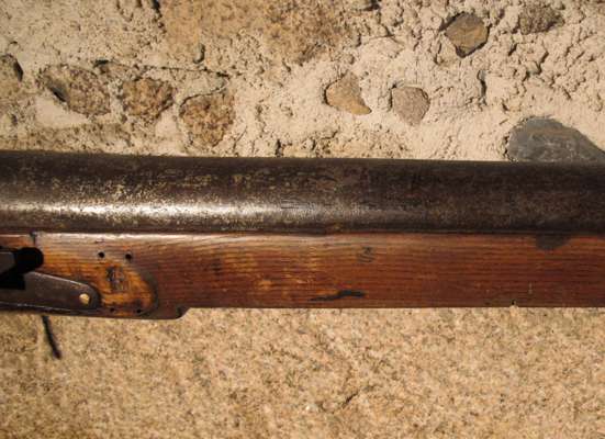 the converted lock with a patent safety feature where the nipple platform can pivot forward, the hammer with welded reinforced cocking ball lever, flat section lock converted from flintlock, short elm half stock with reinforced hook shaped pierced butt,