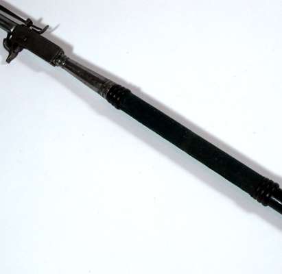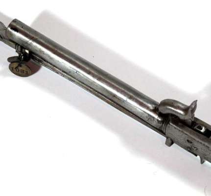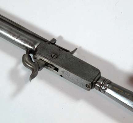 with box lock percussion pistol, lock engraved with foliate scrolls, the spear tip engraved with cross hatching and detachable spear head at the end of the long haft with eleven sided socket, an old brass inventory tag numbered 1031, with a green baize grip at the top of the shaft