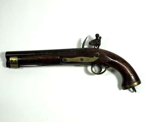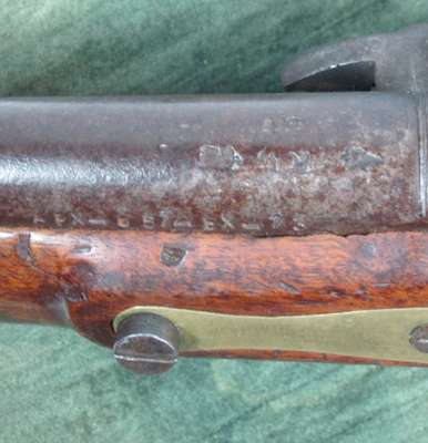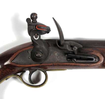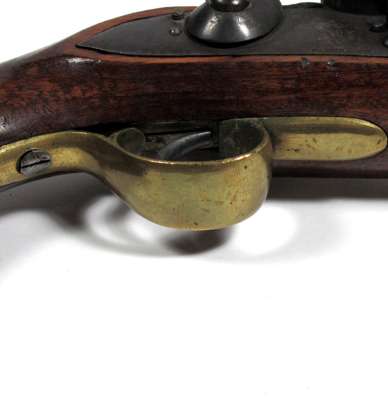 brass furniture, full walnut stock with captive swivel ramrod and lanyard eye in butt, the barrel stamped with RW and gunmaker’s view and proof marks (the captive swivel ramrod differs from the British version in having a riveted brass collar with a spring retaining catch)