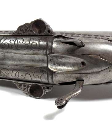 the walnut stock encased in a steel action with flower head border engraving, with cut steel leaves below the pierced wooden pommel, capped in steel and border engraved, shaped block trigger firing both small bore engraved barrels together, the fore-end cut and shaped as flower heads, the match held into the pans with two spilt steel arms, missing ramrod, traces of gilt decoration on the wooden stock